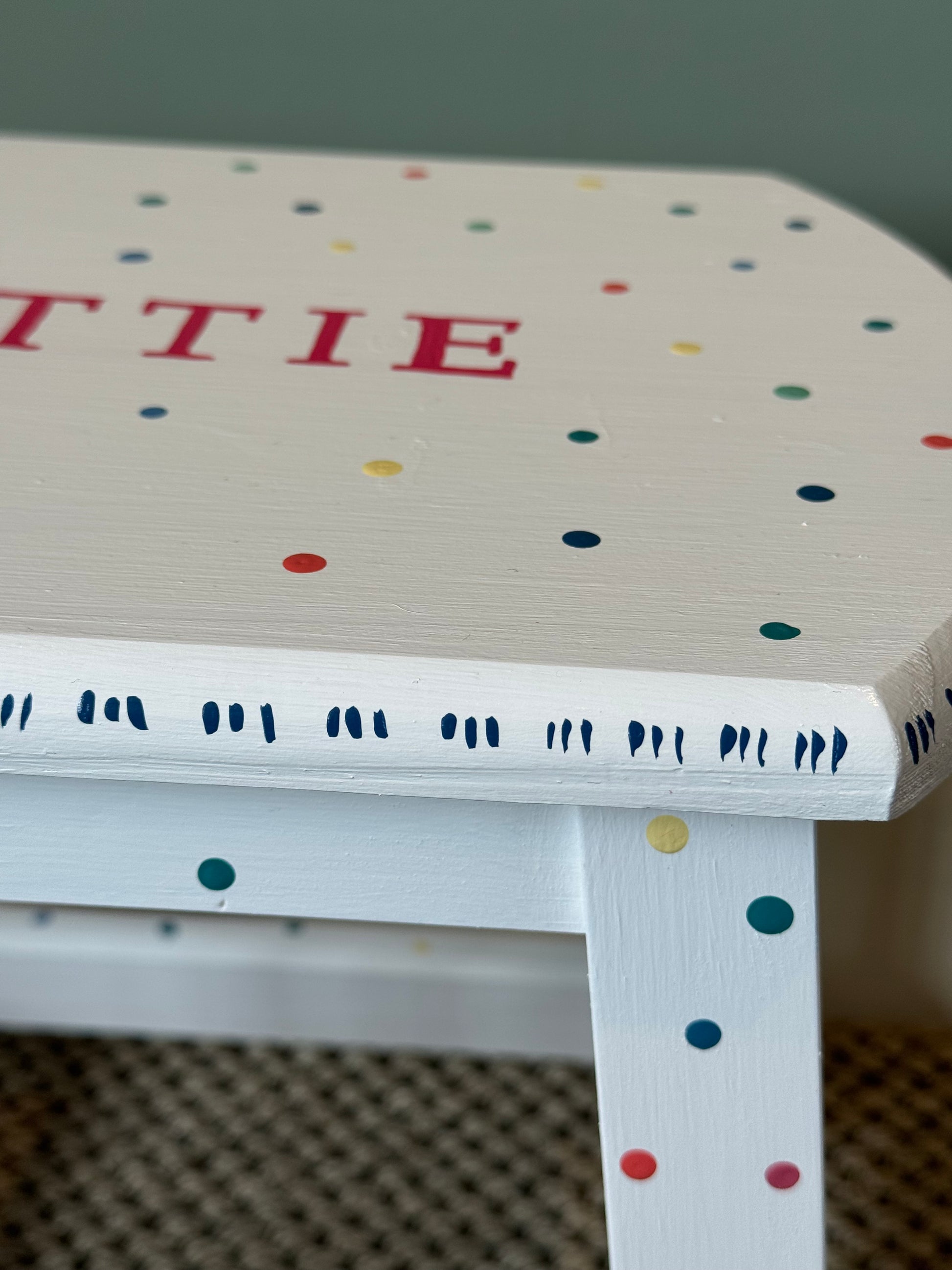 A beautiful personalised hand-painted children's stool. The Dottie stool is painted white with bright, cheerful dots in many colours. Each stool is hand-painted in the UK and personalised with your child's name - a unique piece of children's furniture that will be treasured forever.