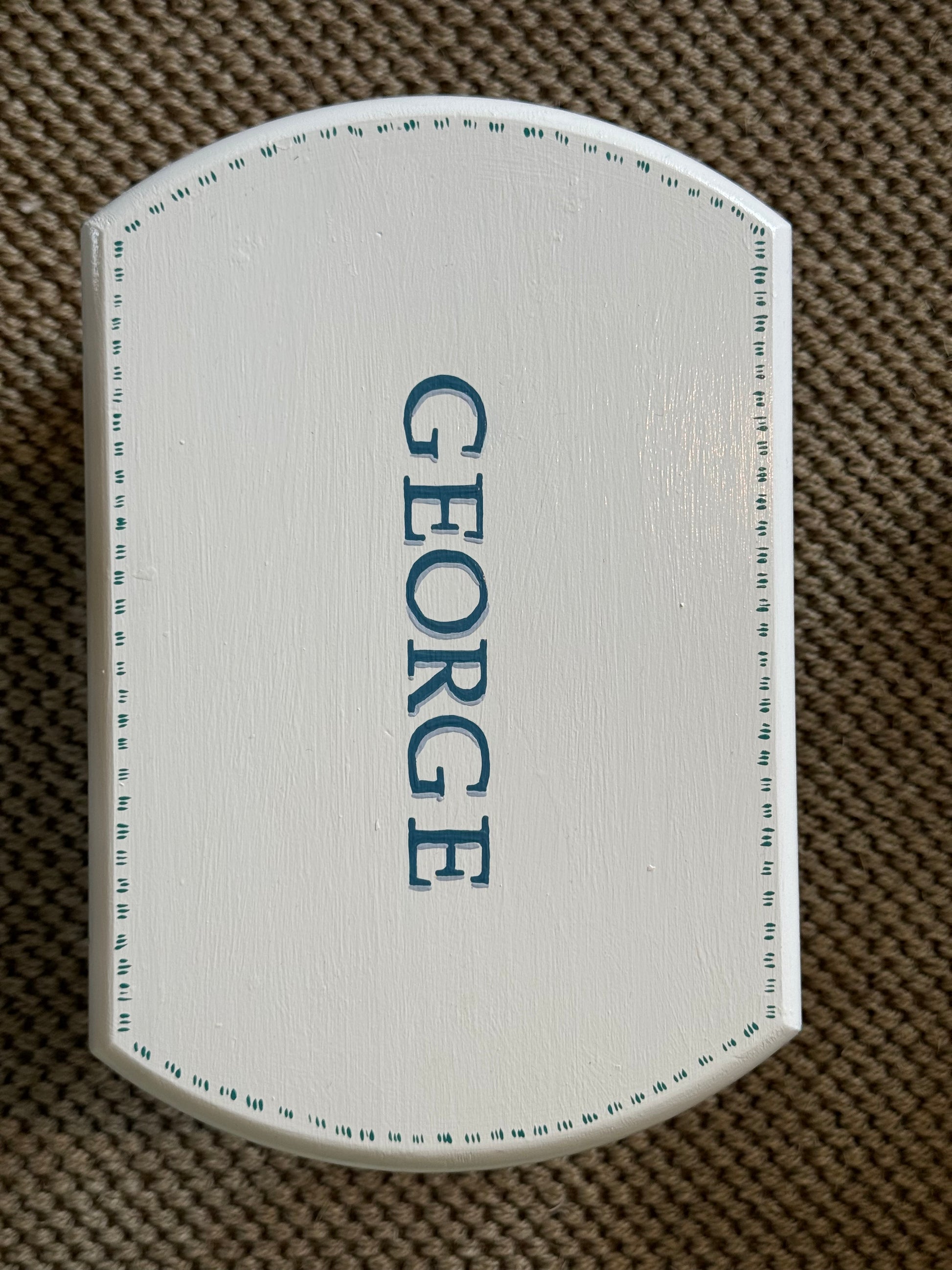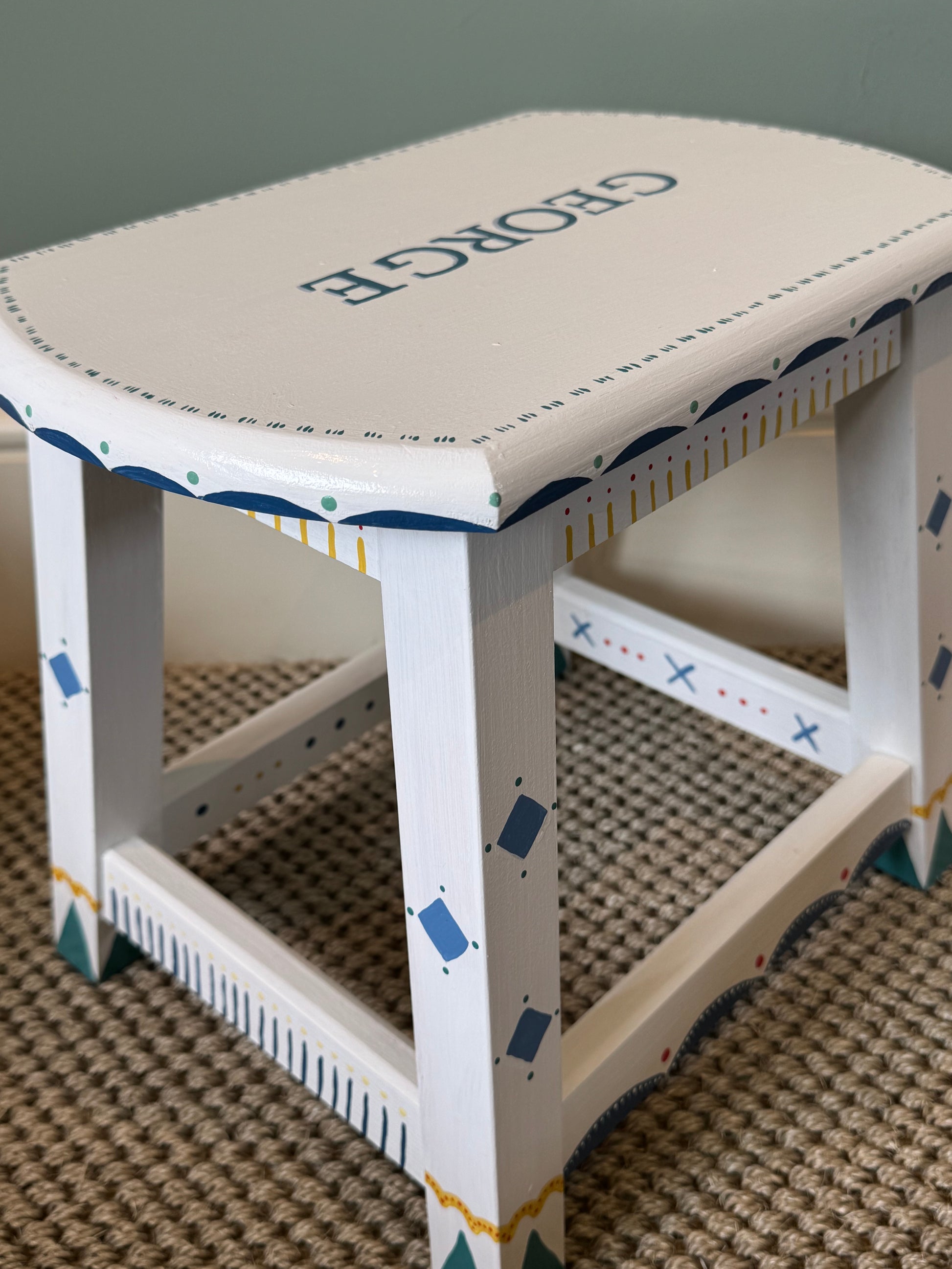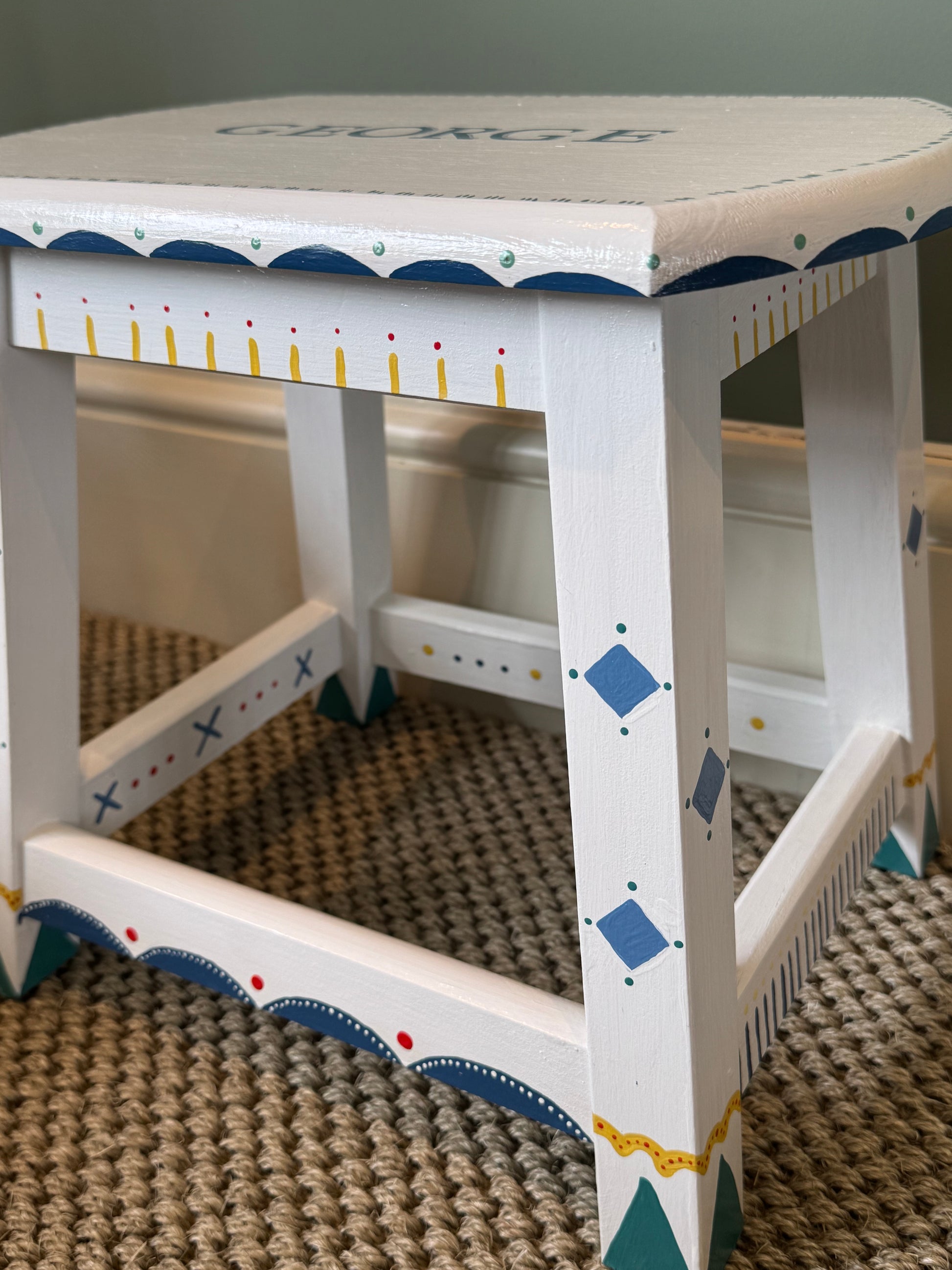 A beautiful personalised hand-painted children's stool. The George stool is white with a fun blue, green and yellow design. Each stool is hand-painted in the UK and personalised with your child's name - a unique piece of children's furniture that will be treasured forever.